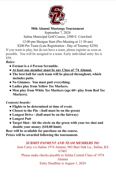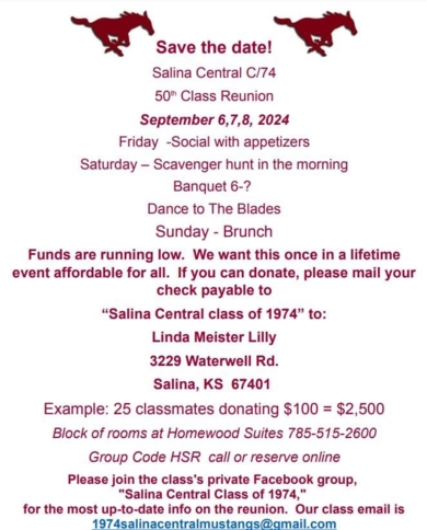 We have received an invitation from South's reunion committee to join them on a bus tour of Salina, Saturday September 7th. They will meet at the South Hi parking lot at 1:45, The bus tour will be from 2:00 to 4:00. Brad Anderson will be the tour guide. Cost is $10 per person. If you would like to participate please call or text Lilly Duncan (South committee chair) directly. Her number is 316-461-5459